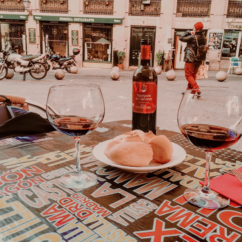 We ventured out and headed toward the Plaza Mayor, which was once the centre of Old Madrid. I feel like it is one of the most well-known plazas in Spain as it opens to an expansive space with stunning architecture, historical tales, Christmas markets in December, and arches leading to laneways out into the labyrinth. This plaza is certainly the epicenter of Madrid Life! I just loved how the wrought-iron balconies provide the most stunning backdrop for this square. We spent some time exploring the Christmas markets here and made a note that we would come back at night to see the festive lights. From here we made our way to the Mercado de San Miguel – a covered market offering local food, delicacies and wine while you explored all in the most elegant ambiance. It is well known as a monument for Spanish cuisine and a meeting point for food lovers! I was in heaven! We grabbed a glass of Rioja wine and began to explore the food, dessert and drink stands. Here you will find the finest of Iberian hams, the freshest seafood and the most divine cheeses. We decided on having lunch here, our first experience with the highest-quality Spanish tapas. To this day, this is my favourite gastronomic markets from all our trips. We headed back to our hotel since it was so close, decided on a siesta and then freshened up before heading out for the traditional late night European dinner. We began to explore and decided on the Tapas & Mas restaurant to enjoy some classic tapas with a bottle of Rioja in a unique setting with brick walls and a warm vibe.