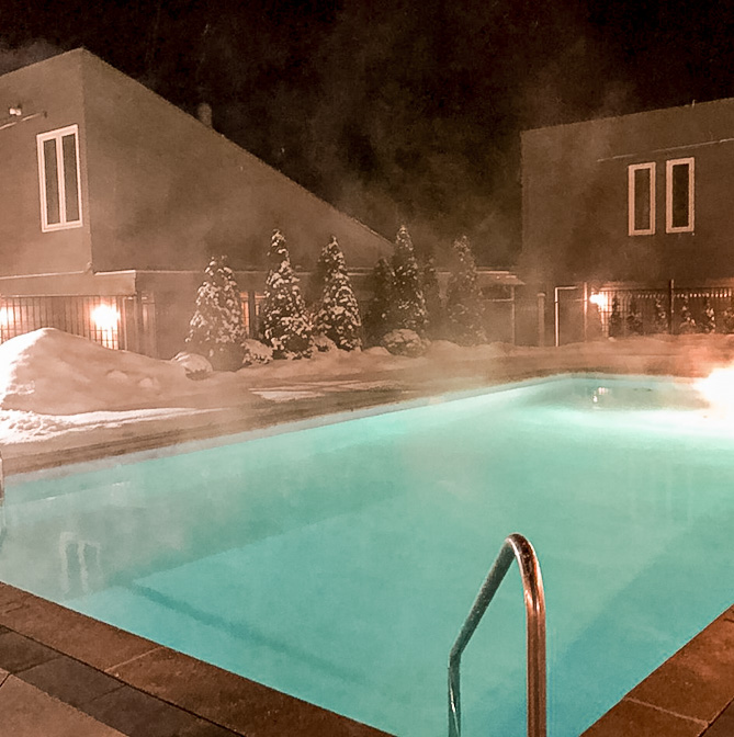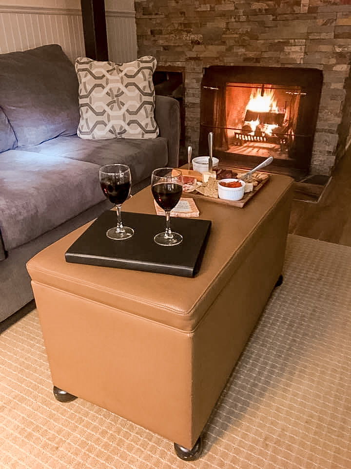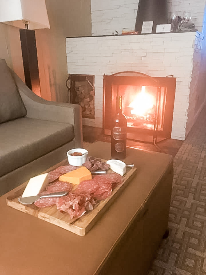 We always reserve a Croft Room as we love having a wood burning fireplace especially during Canadian winters and it offers closer proximity to the spa and hot springs.  The rooms are spacious with a bedroom loft, heated bathroom floors, and a back porch that faces a winter wonderland of trees.  With some Croft Rooms, you can have your own private hot tub on the back porch, but we typically save that additional money for dinner out in Alton the second night – which I will talk about later.  You still have full access to the outdoor Scandinavia spa type pools so unless you want the intimate privacy then just a regular Croft Room will do just fine.  We always arrive early on our first day, build a fire, crack a bottle of our favourite Rioja and indulge on a small cheese board while we begin to unwind and let the stress melt away.  We talk, we laugh and if it’s your birthday, you must share your goals and dreams for the upcoming year!