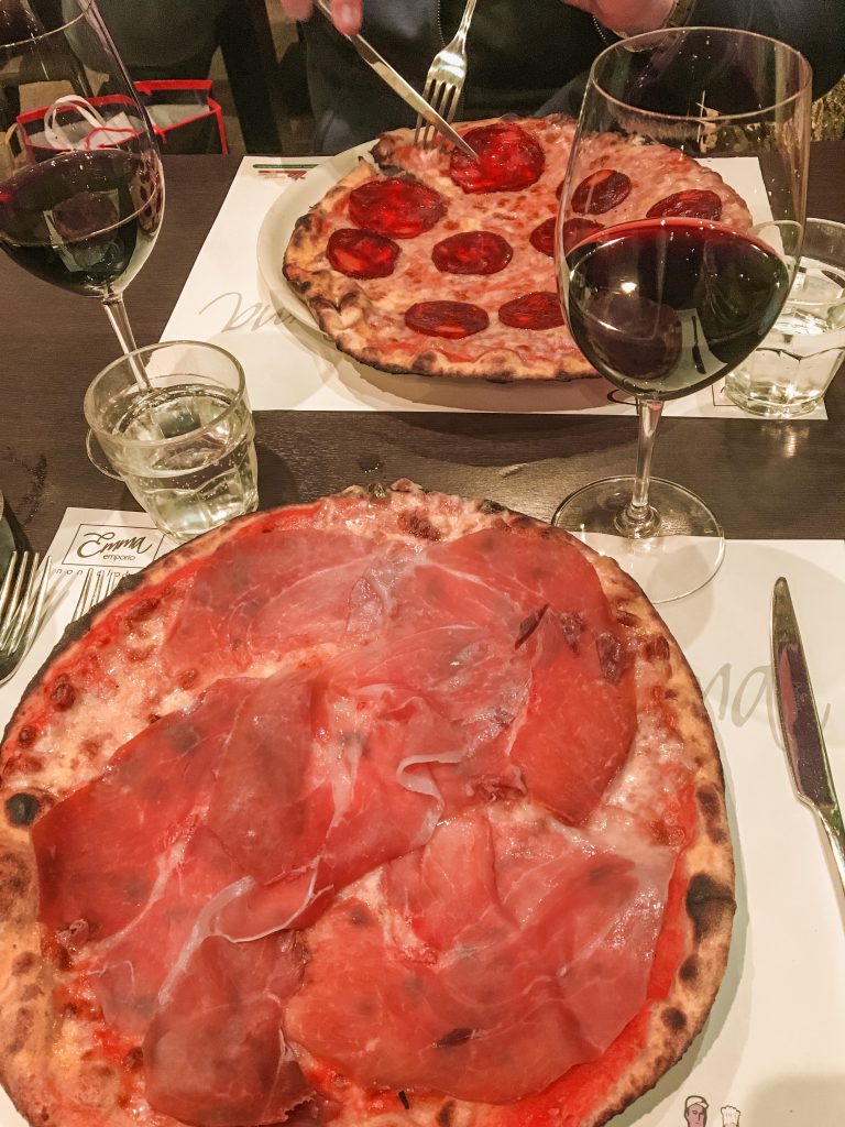 Once back at the hotel, we showered and got ready for dinner. As it was a Friday night, we had made reservations at Emma for dinner. It was recommended to us by a local stating it was the best sit-down pizza in Rome. That’s a big declaration, but she was spot on! Obviously, we ate some pizza on this trip, but hands down this was the best pizza of the trip and it was only the first night. Pizza was Roman style and paired nicely with a bottle of red. I had the Prosciutto pizza and D had the Chorizo. After dinner, we strolled back to our hotel and grabbed a gelato across the street just before the store closed – a perfect night cap to our first day. And yes, that was our second gelato that day. When in Rome!