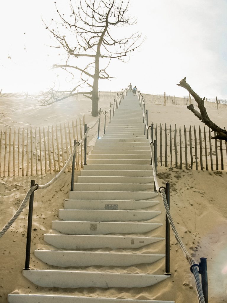 No trip to Arcachon would be complete without visiting the Dune du Pilat, which is 100m high and 2.7 km long, towering above the Atlantic Coast on one side and the forest on the other. You can access the top by the staircase along with some climbing in the sand where you will be delighted with the most spectacular view. Be sure to pack water, especially if traveling in peak season as the unrelenting sun can be intense paired with the physical activity of the climb. At the top, we saw people sunbathing, having lunch, kids rolling around in the sand down the dune and those sandboarding….like snowboarding, but on sand! From here you can see the Cap Ferret lighthouse, a beacon for ships! Again, you can access and climb the Dune for free!
